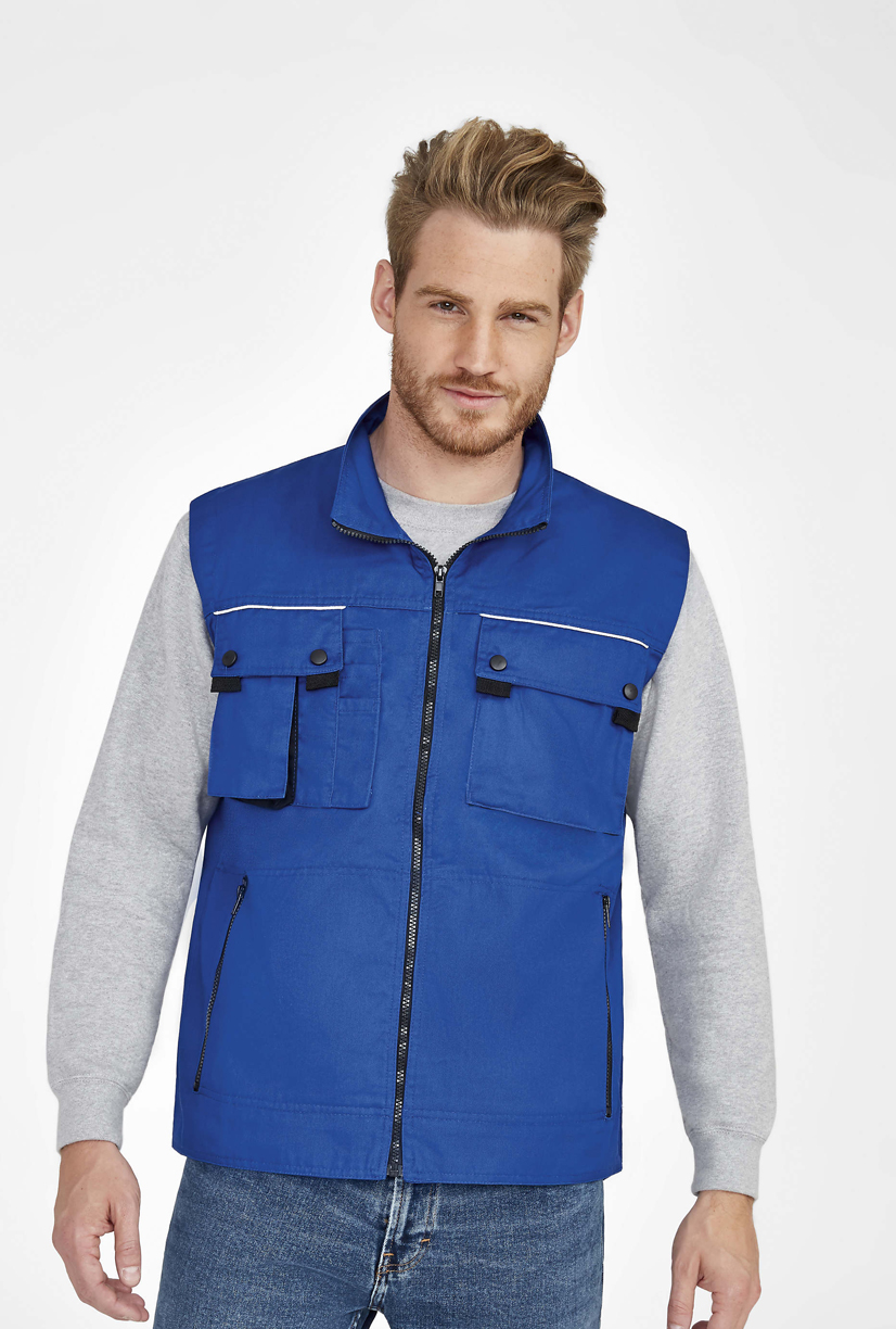 Unisex-Workwear-Bodywarmer | Sechs Taschen, inklusive einer Handytasche und einer Innentasche | Taschenklappen mit Reflektions-Streifen | Drei Stifttaschen | Integrierter, schwarzer Reißverschluss