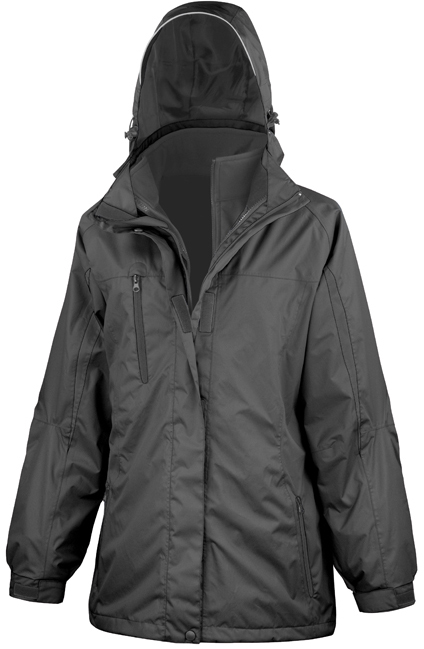 Damen 3-in-1-Journey-Jacke mit Softshell-Innenjacke | Wasserdicht bis 3.000 mm | Atmungsaktiv 3.000 g/m² / 24h | Windproof | Außenjacke: Durchgehender 2-Wege-Reißverschluss vorne | Windschutzleiste mit Klettverschluss und Druckknöpfen | Front- und Brusttasche mit Reißverschluss | Elastische Ärmelbündchen mit Klettverschluss | Abnehmbare, verstellbare Kapuze mit reflektierendem Schirm | Saum mit verstellbarem, elastischen Kordelzug | Ripstop Material | Kragen mit Trikotfutter | Nähte getaped | Taillierte Passform | Zweiter Reißverschluss innen zum Befestigen der Innenjacke | Softshell Innenjacke: Durchgehender Reißverschluss vorne | Innen- und Seitentaschen | Gerader Ärmelabschluss | Taillierte Passform | Veredelungszugang: innen im Brustbereich links und Saum auf der Rückseite