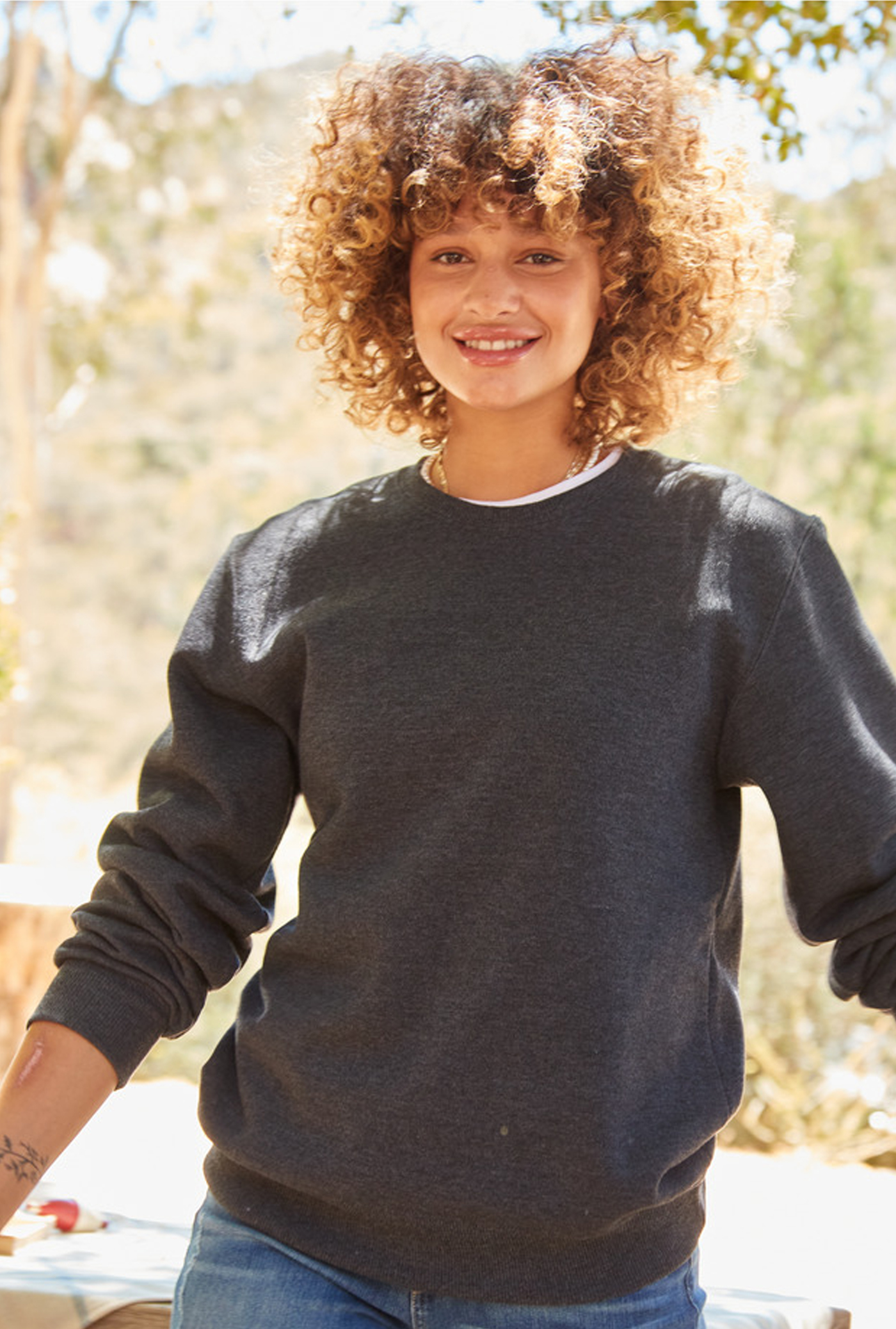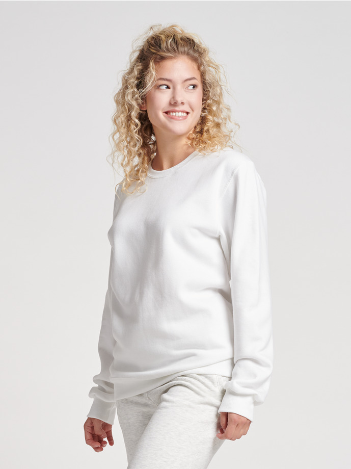Gekämmte, ringgesponnene Baumwolle / Recycelter Polyester | Baumwollreiches 3-Enden-Fleece für hervorragende Weichheit | Hergestellt aus 100 % recyceltem Polyester und nachhaltig angebauter Baumwolle aus den USA | Feuchtigkeitsableitung für ganztägigen Komfort | Hohe Maschendichte für eine glatte Druckfläche | 2x2-Rippbündchen an Kragen, Ärmelabschluss und Bund | Zweinadel-Deckstich an Hals, Armausschnitt und Bund | Schulter-zu-Schulter-Tape