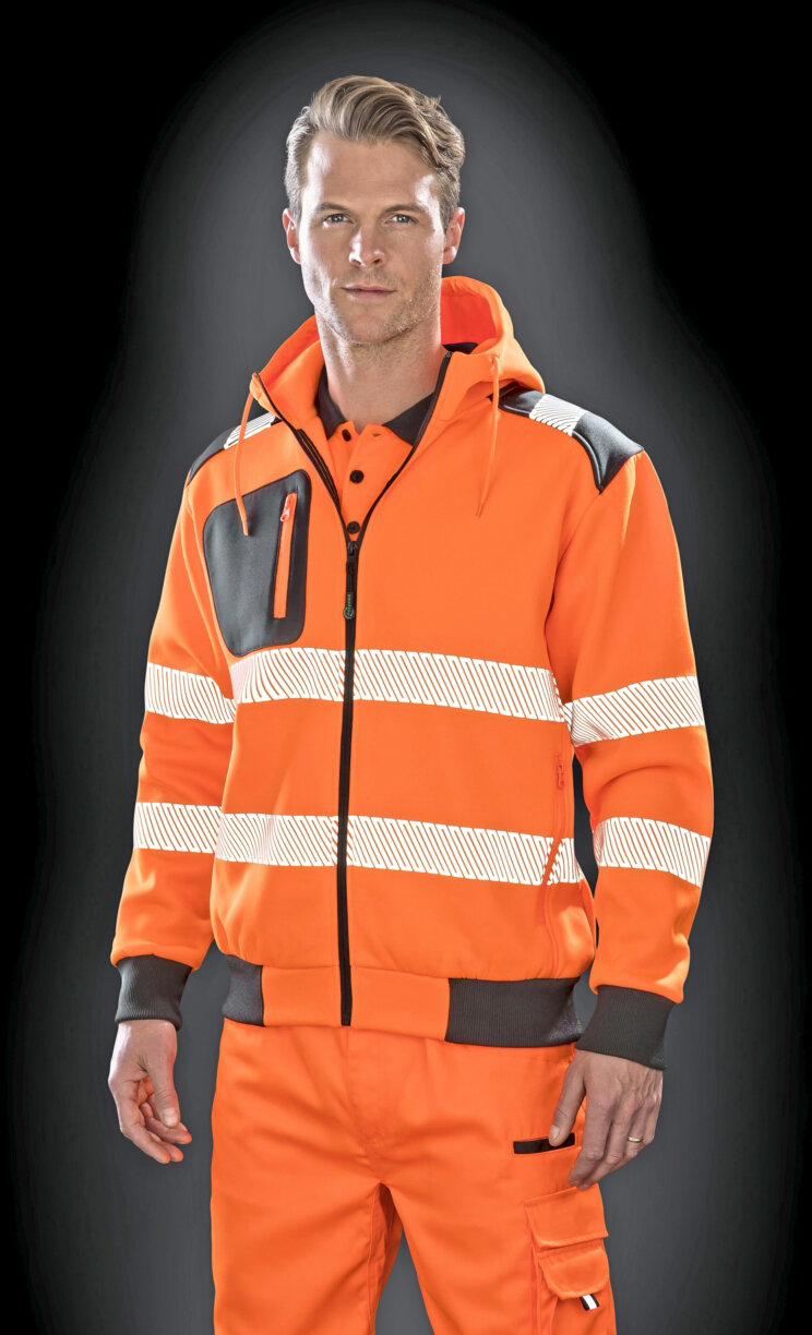 Slub Garn | Unisex Sweat-Jacke mit fluoreszierenden Teilen | Durchgehender Reißverschluss mit fluoreszierenden Puller | Kapuzeninnenseite aus Meshgewebe, Kordelzug und Metall-Ösen in fluoreszierender Farbe | 1x1 Ripp-Strick am Ärmelbündchen und Saum | Zwei Fronttaschen | Verstärktes Nackenband | Herausreißbares Label | Innenseite nicht angeraut