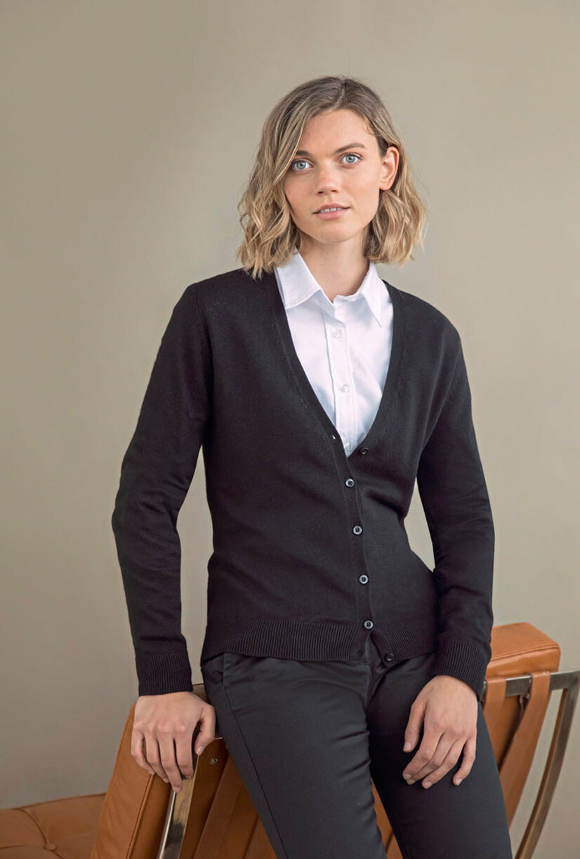 Feinstrick | 12 Gauge | Abgepasste Details an Ärmeln und Ausschnitt | Einfarbige Perlglanzknöpfe | Eingesetzte Ärmel | 1x1-Ripp-Strick an Kragen, Bündchen und Saum