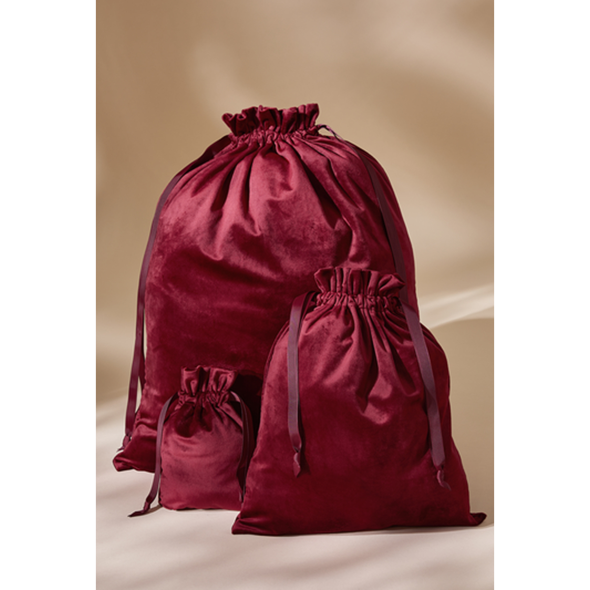 100% recyceltes Polyester-Samtgewebe | Kordelzug-Verschluss | Grosgrain-Band in gleicher Farbe | Abreißetikett | Volumen: 1 Liter bei Größe S, 7 Liter bei Größe M, 25 Liter bei Größe L